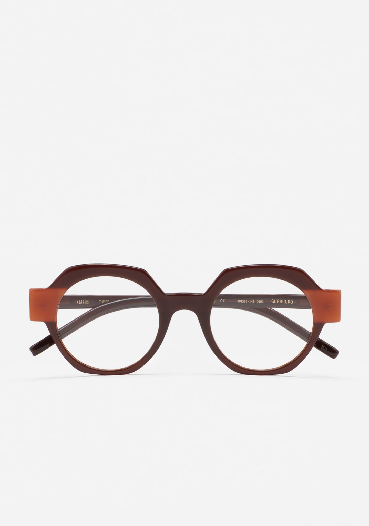 Round-shaped optical frames with a flat brow. Translucent brown acetate front with translucent orange laminate. Translucent brown acetate temples. Built-in acetate nose pads. Handmade.