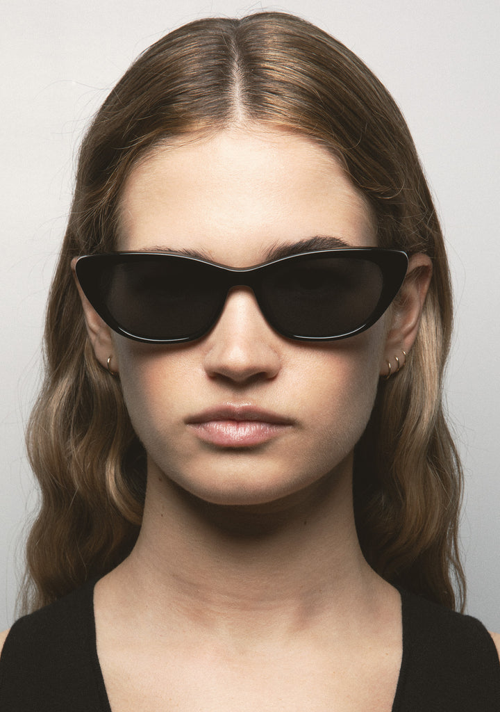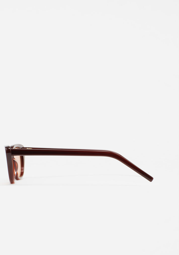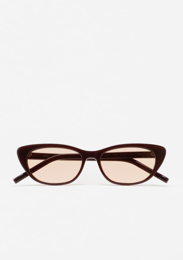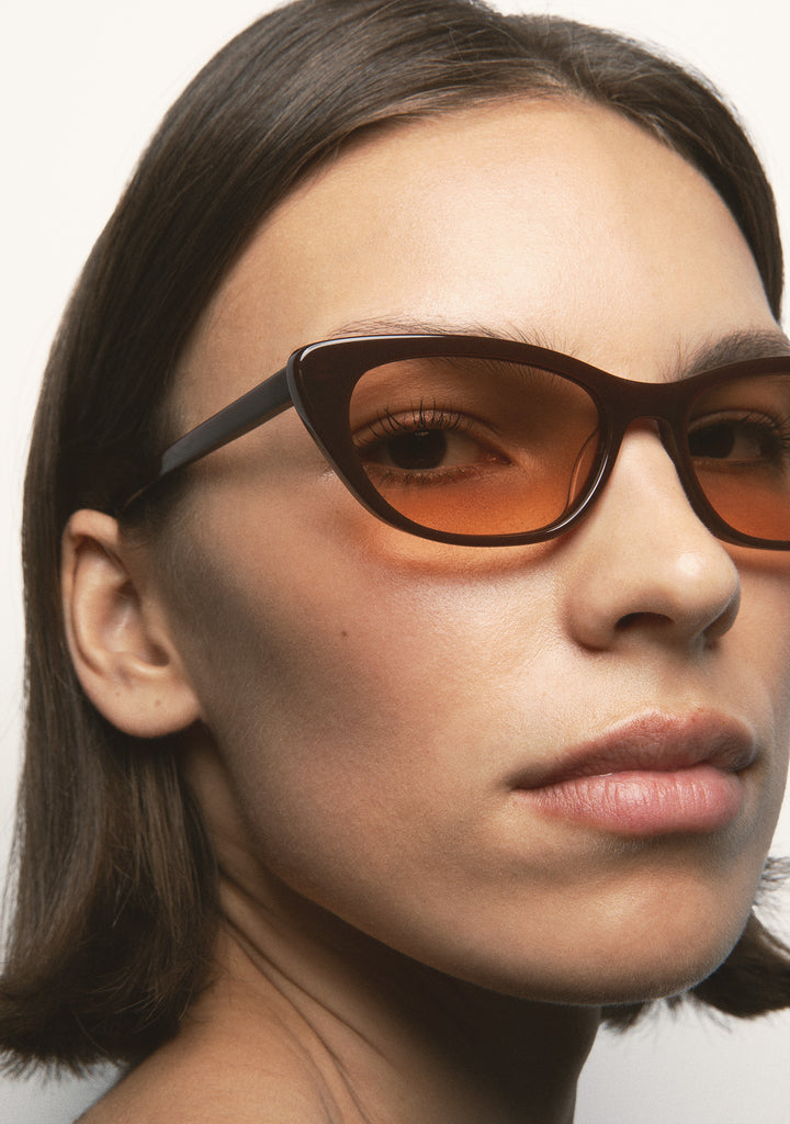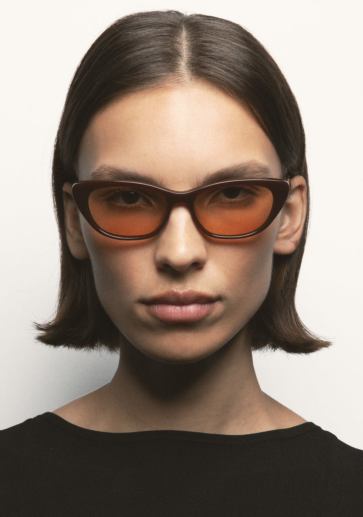 Cat-eye sunglasses. Translucent brown acetate front and temples. Brown photochromic lens, base 2, with UV protection and anti-reflective treatment. Category 1-3 lens. Integrated acetate nose pads. Handmade.